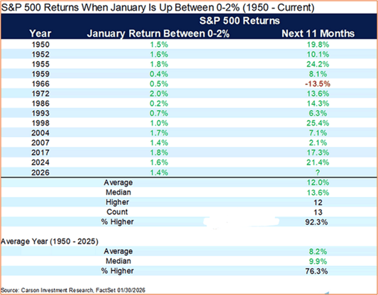 The exhibit above dates back to 1950 and it shows only those years when the S&P 500gained between 0% to 2% in January. For those 13 years, the Index finished the year with a 12.0% return on average, much higher than the respective 8.2% gain for all years since 1950.